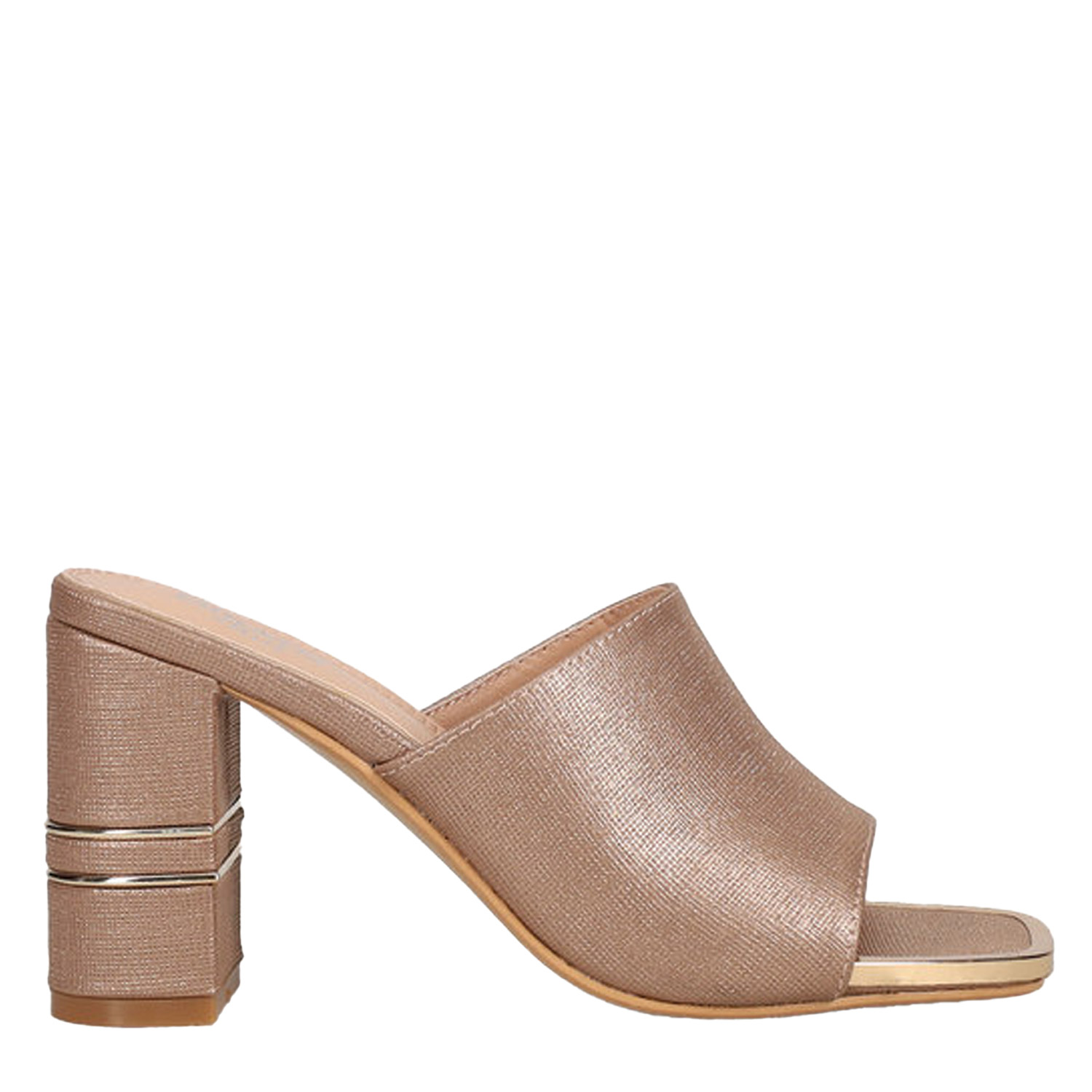 Ροζ χρυσό mule πέδιλο. Διαθέτει μαλακό μαξιλαράκι στη σόλα, φαρδιά φάσα και χοντρό ψηλό τακούνι.