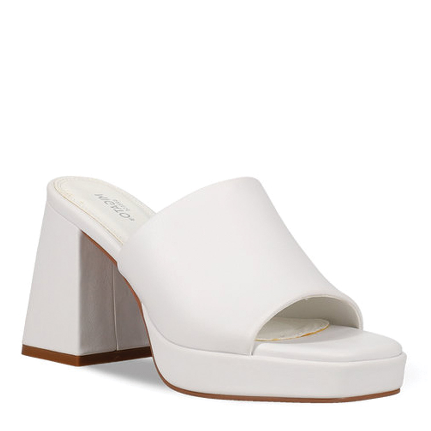 Λευκό mule πέδιλο. Διαθέτει μαλακό μαξιλαράκι στη σόλα, φαρδιά φάσα, φιάπα και ψηλό χοντρό τακούνι.