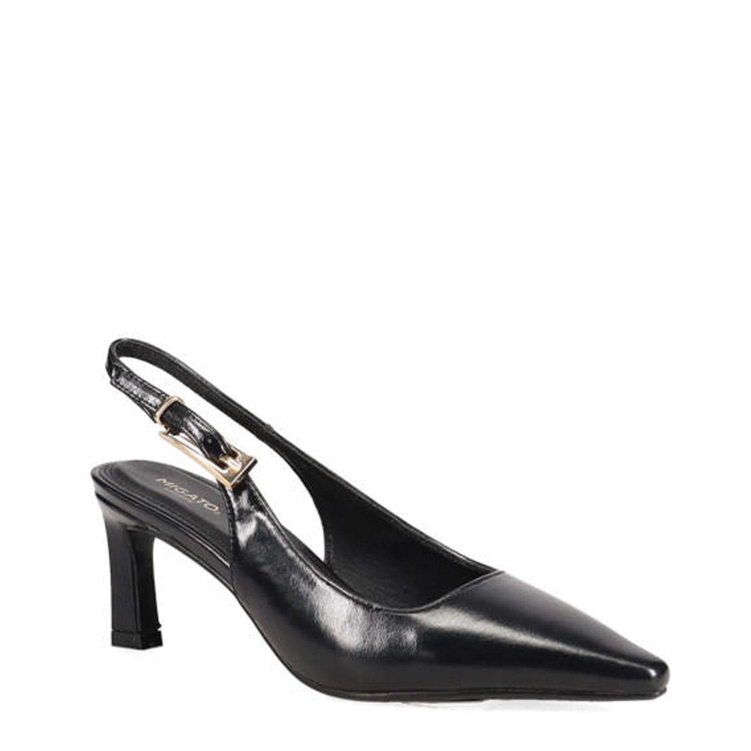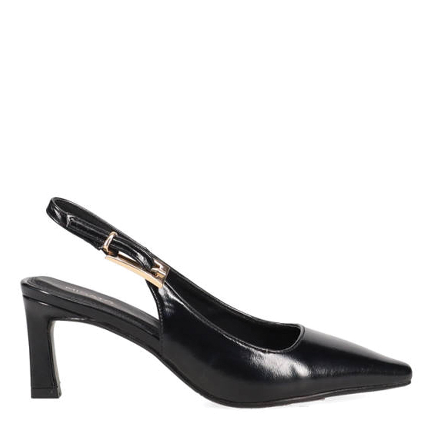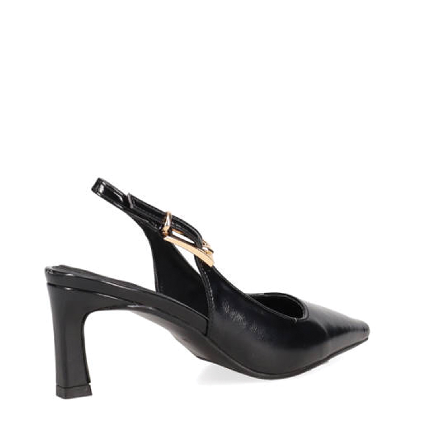 Μαύρη εξώφτερνο mule. Διαθέτει μυτερή φόρμα και μεσαίο τακούνι. Δένει με ρυθμιζόμενο λουράκι στη φτέρνα.
