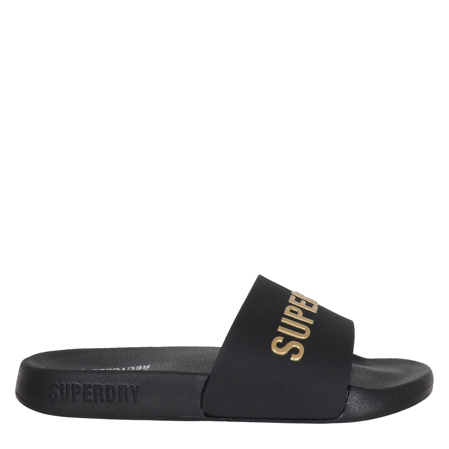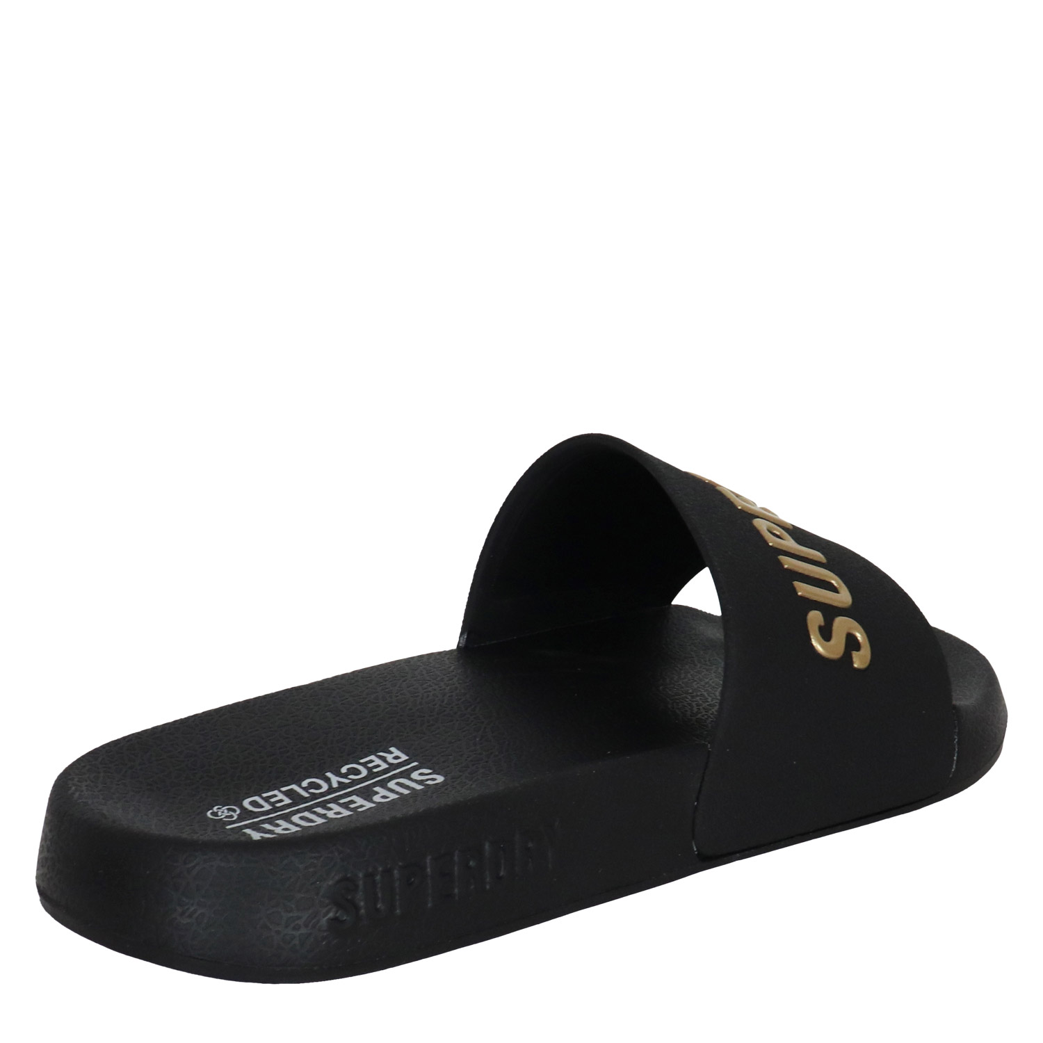 Superdry γυναικεία slides σε μαύρο με χρυσό χρώμα κατασκευασμένα από πολυουρεθάνη. Ύψος σόλας 3εκ.