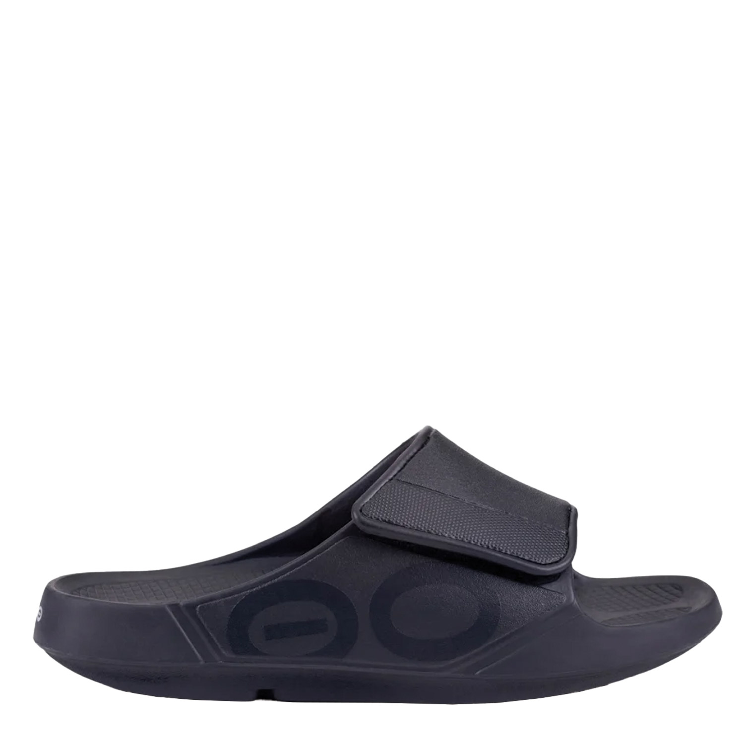 Oofos γυναικείο slide σε μαύρο χρώμα κατασκευασμένο από οικολογικό δέρμα. Ύψος σόλας 2εκ.