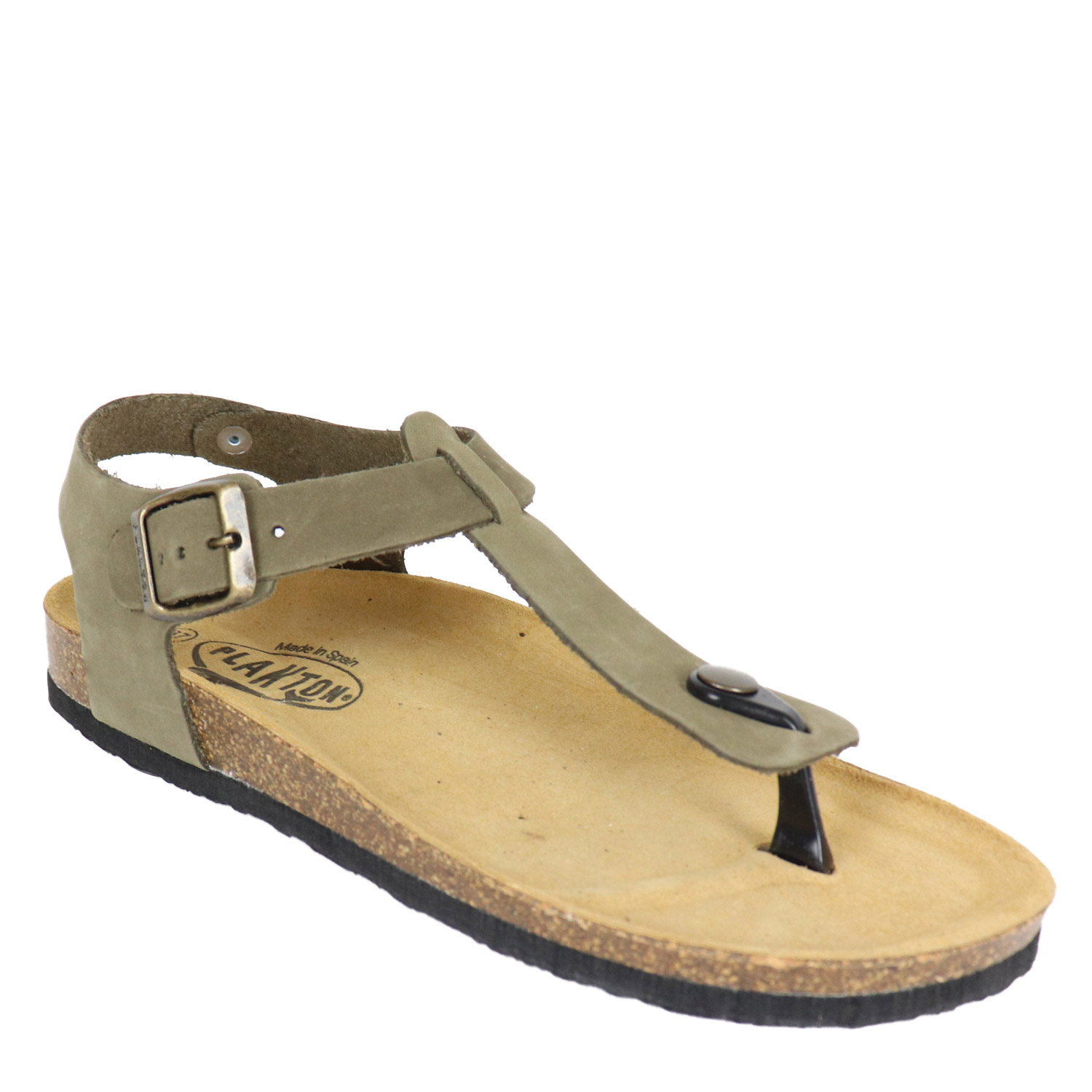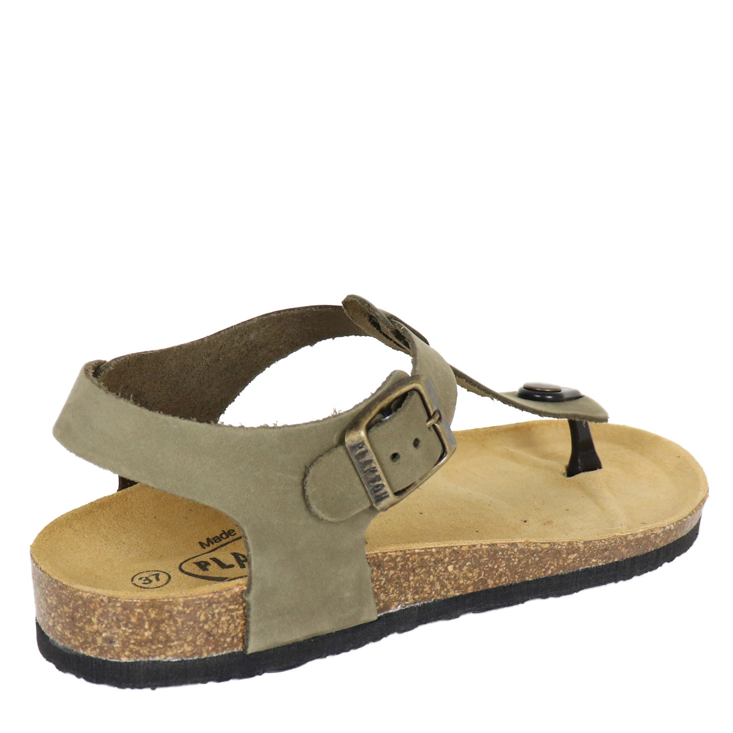 Plakton γυναικείο σανδάλι σε χακί χρώμα κατασκευασμένο από δέρμα, με δερμάτινο ανατομικό πατάκι. Ύψος 2.5εκ.