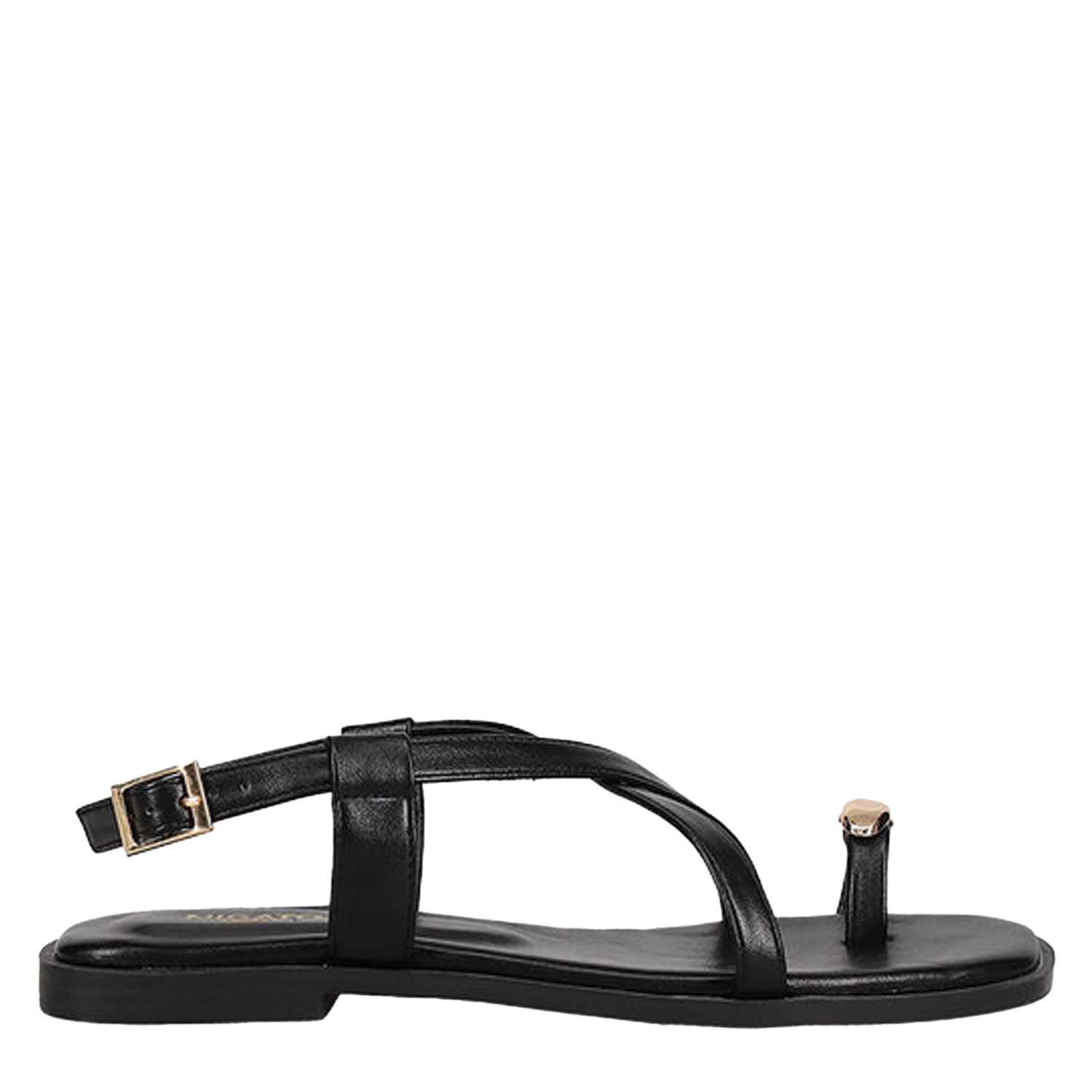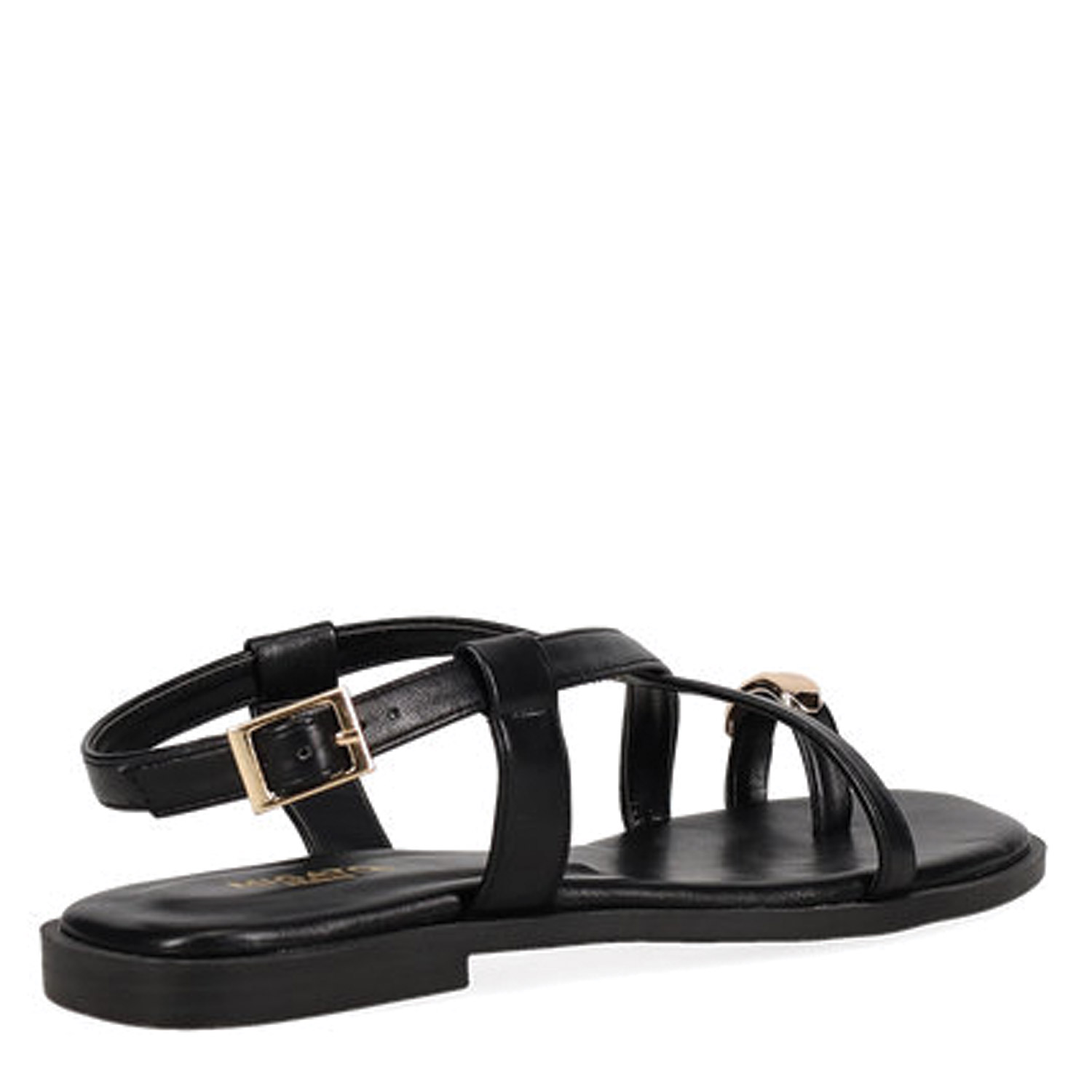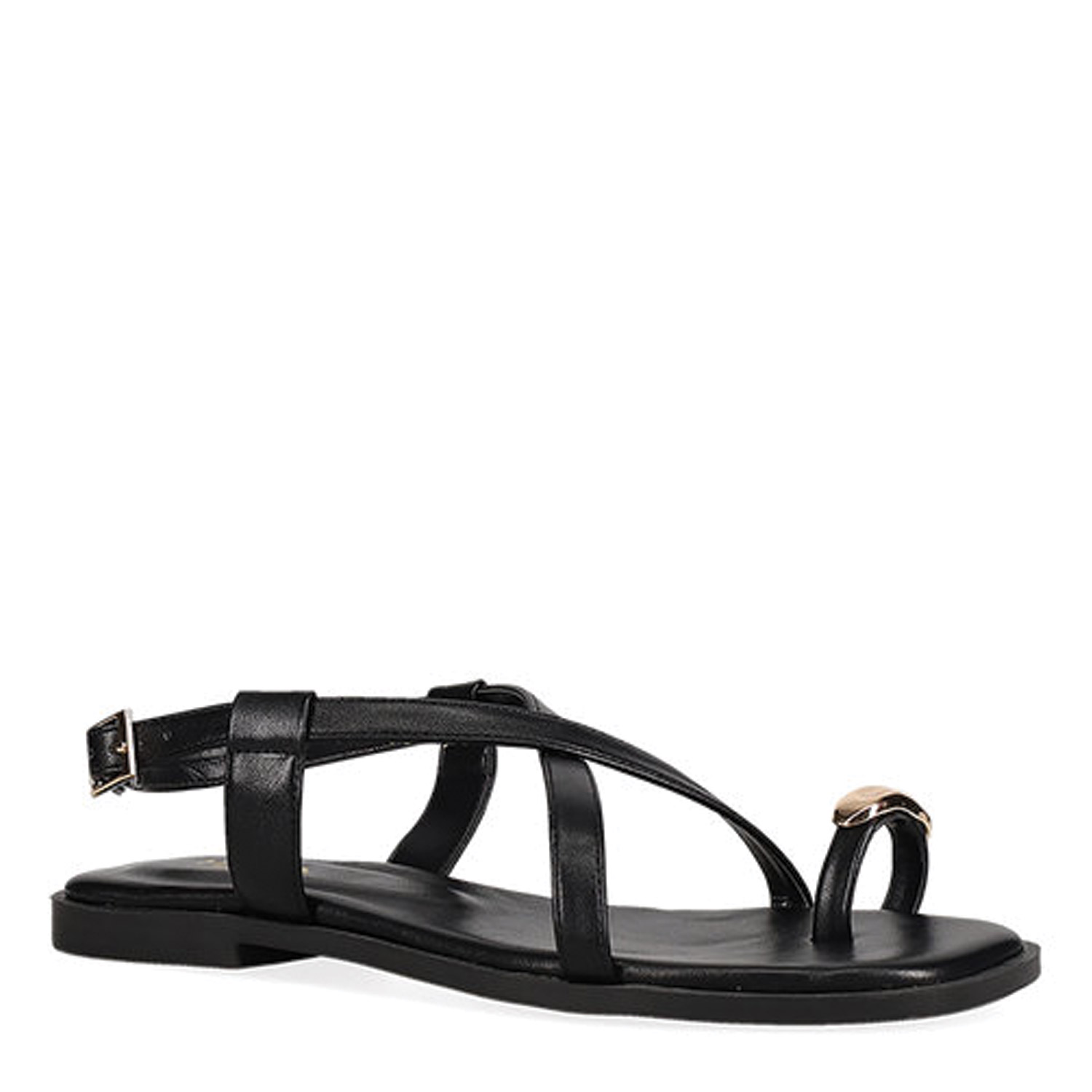 Μαύρο σανδάλι. Διαθέτει toe ring και χιαστί λουράκια. Δένει με ρυθμιζόμενο λουράκι στη φτέρνα.