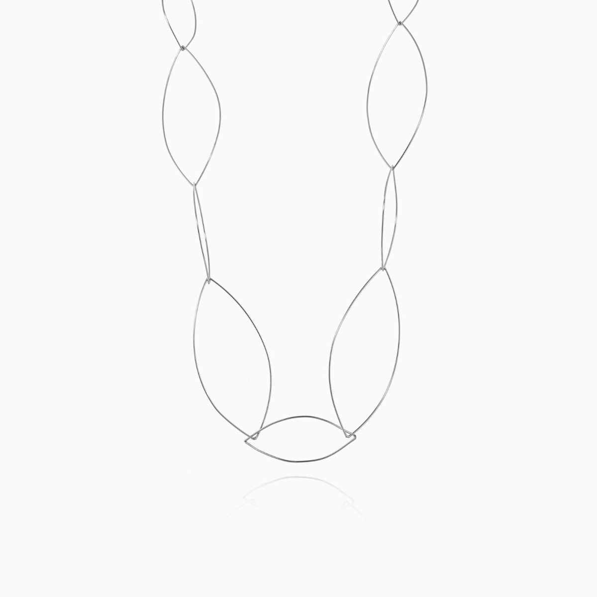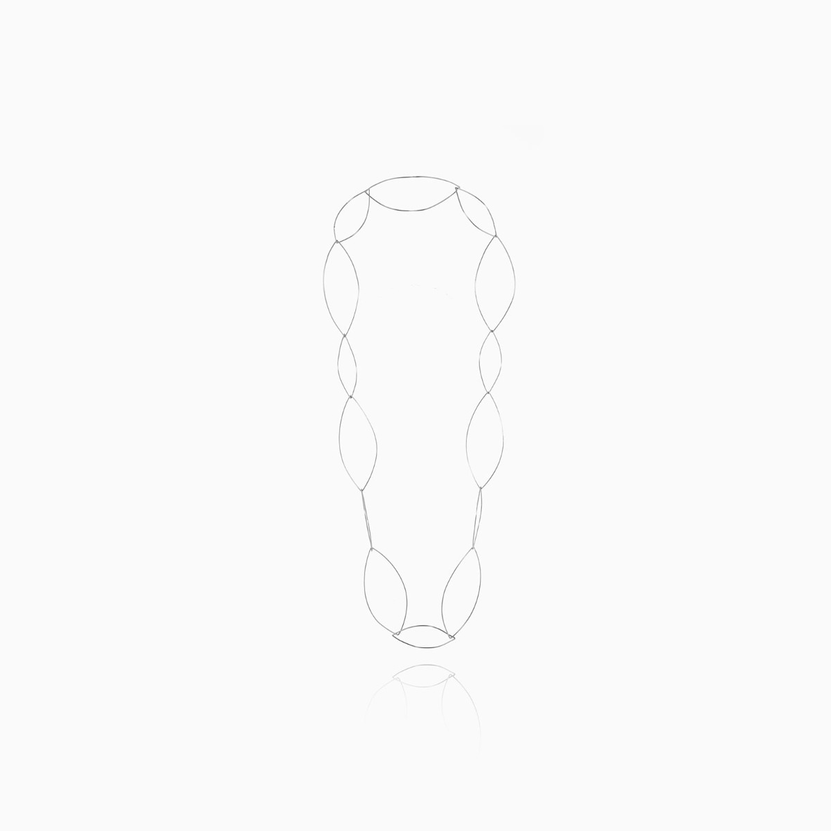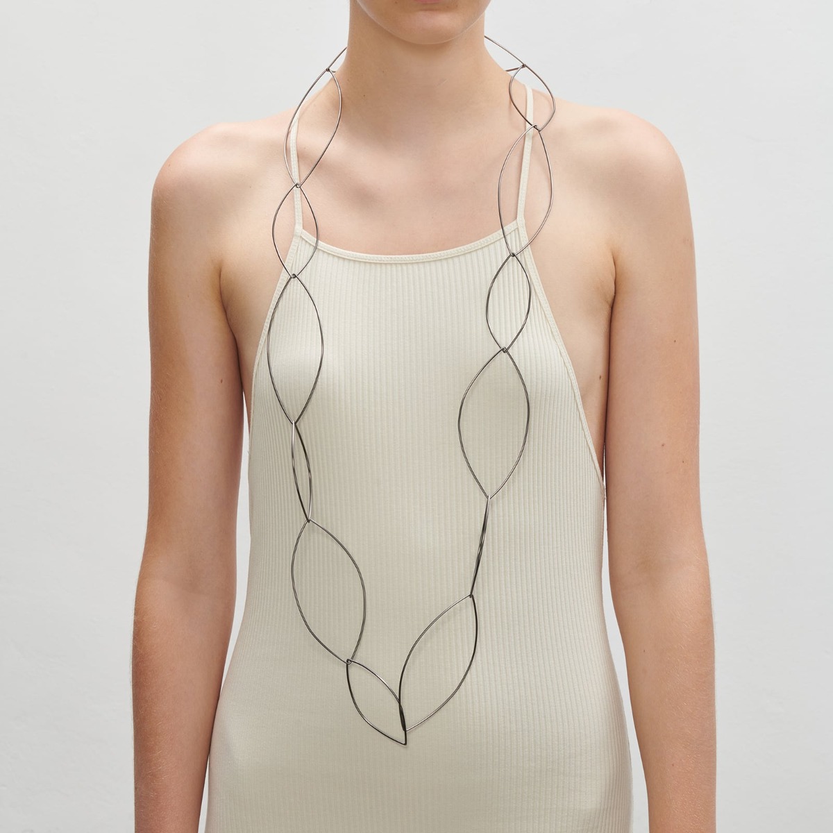 Ντελικάτη κίνηση, φίνα μεταλλική λάμψη και διακριτική γεωμετρία συνθέτουν αυτό το κομψό κολιέ-αλυσίδα. Το ελλειπτικό σχήμα των εναλλακτικών «κρίκων», που συνδυάζει απαλές καμπύλες με αιχμηρές γωνίες, αφήνει μια ανάλαφρη, ισορροπημένη αίσθηση στην εμφάνιση. •Ορείχαλκος με μεταλλική μαύρη επιμετάλλωση