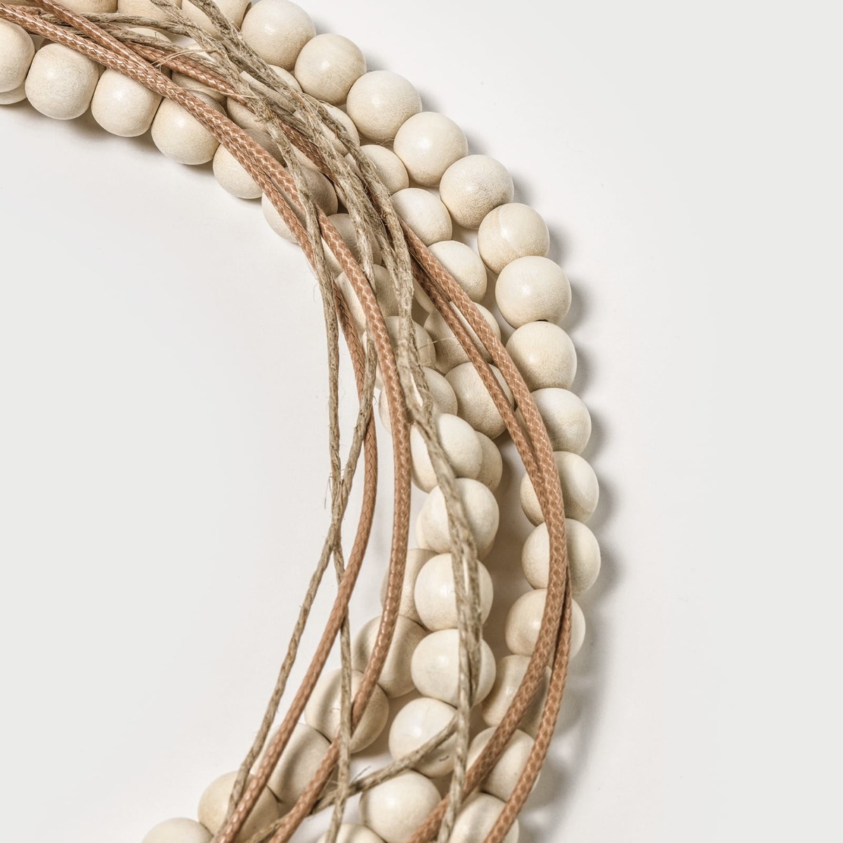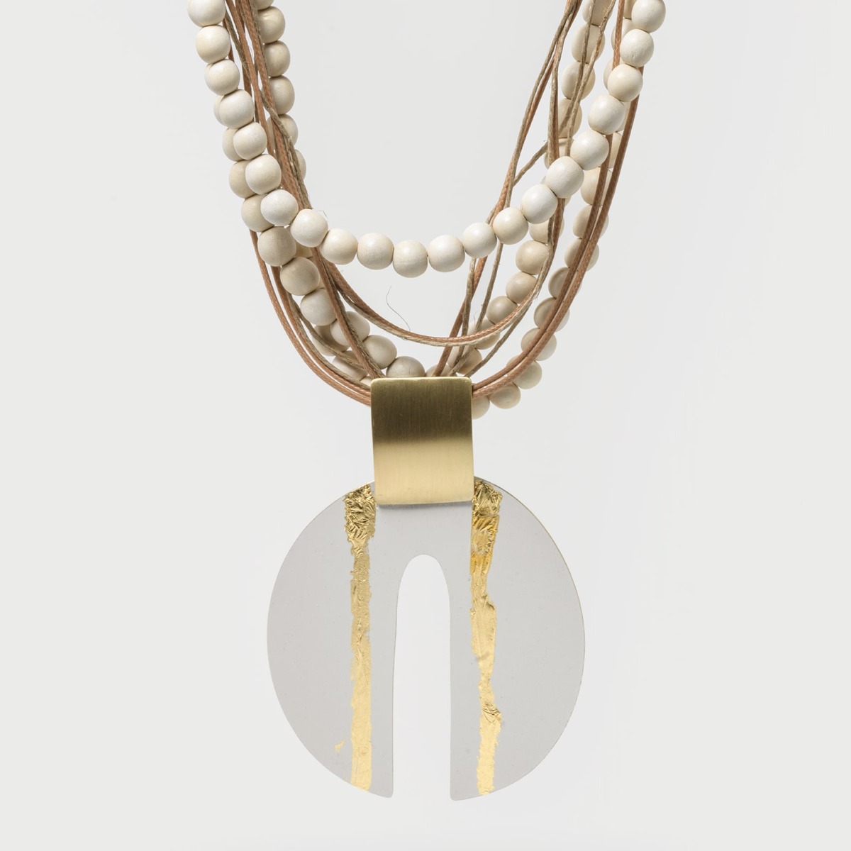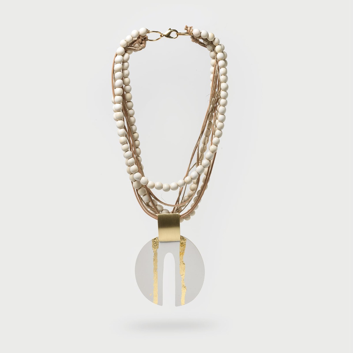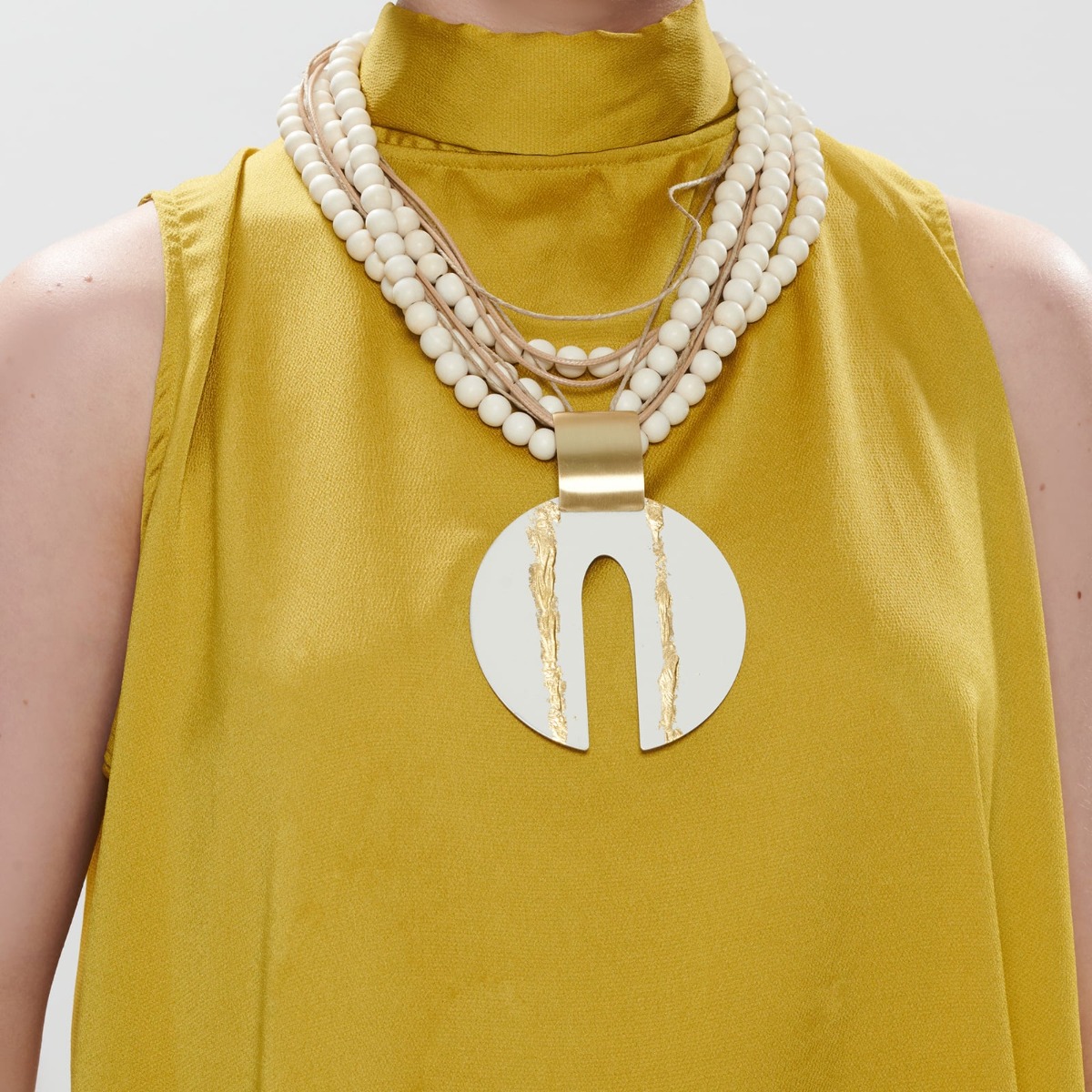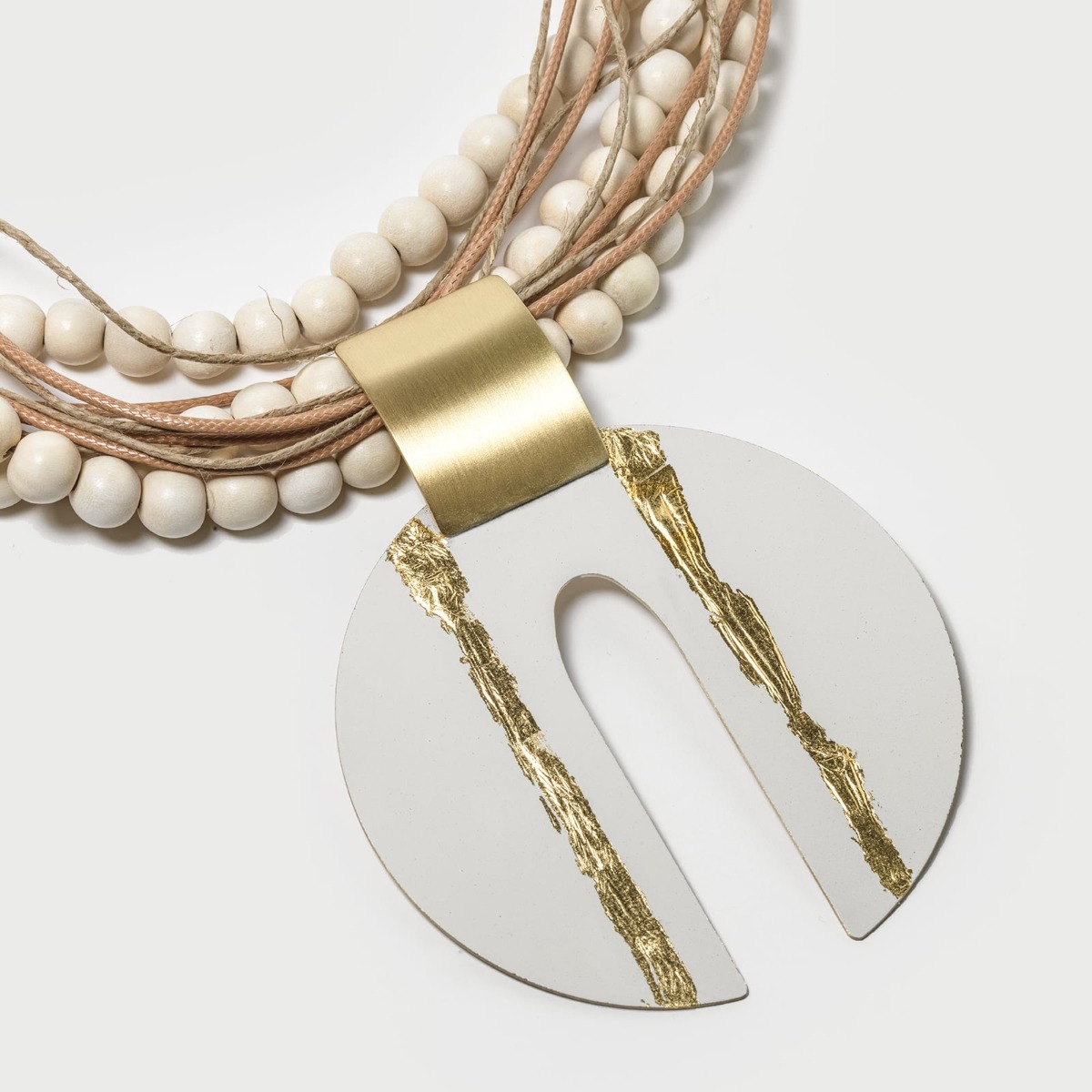 Οι γήινες υφές του μπεζ σχοινιού, του ξύλου και του δέρματος αντιπαραβάλλονται με την αυστηρή γεωμετρία και τον μεταλλικό μινιμαλισμό δημιουργώντας ένα statement χειροποίητο κολιέ. Οι ξύλινες σφαίρες, τα κορδόνια από δέρμα και φυσικό λινάρι κι ο λευκός οξειδωμένος δίσκος με τα φύλλα χρυσού συνυπάρχουν σε ένα πληθωρικό κόσμημα με έθνικ attitude. •Ορείχαλκος με επεξεργασία •Φύλλα χρυσού 24k •Ξύλινες σφαίρες •Δερμάτινα κορδόνια •Κορδόνια από φυσικό λινάρι