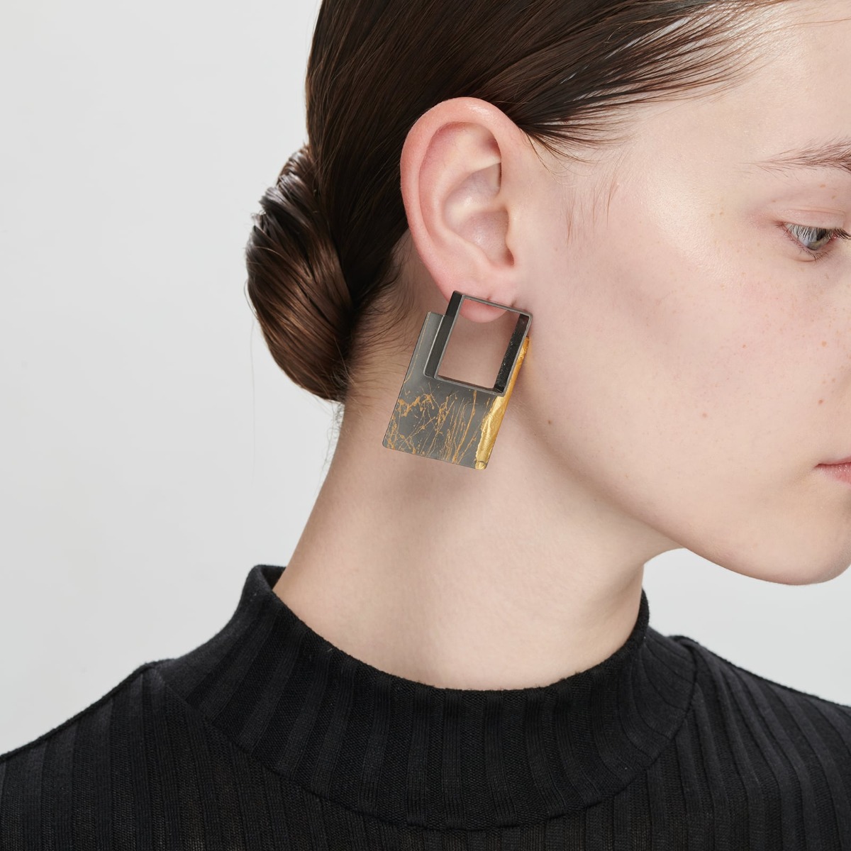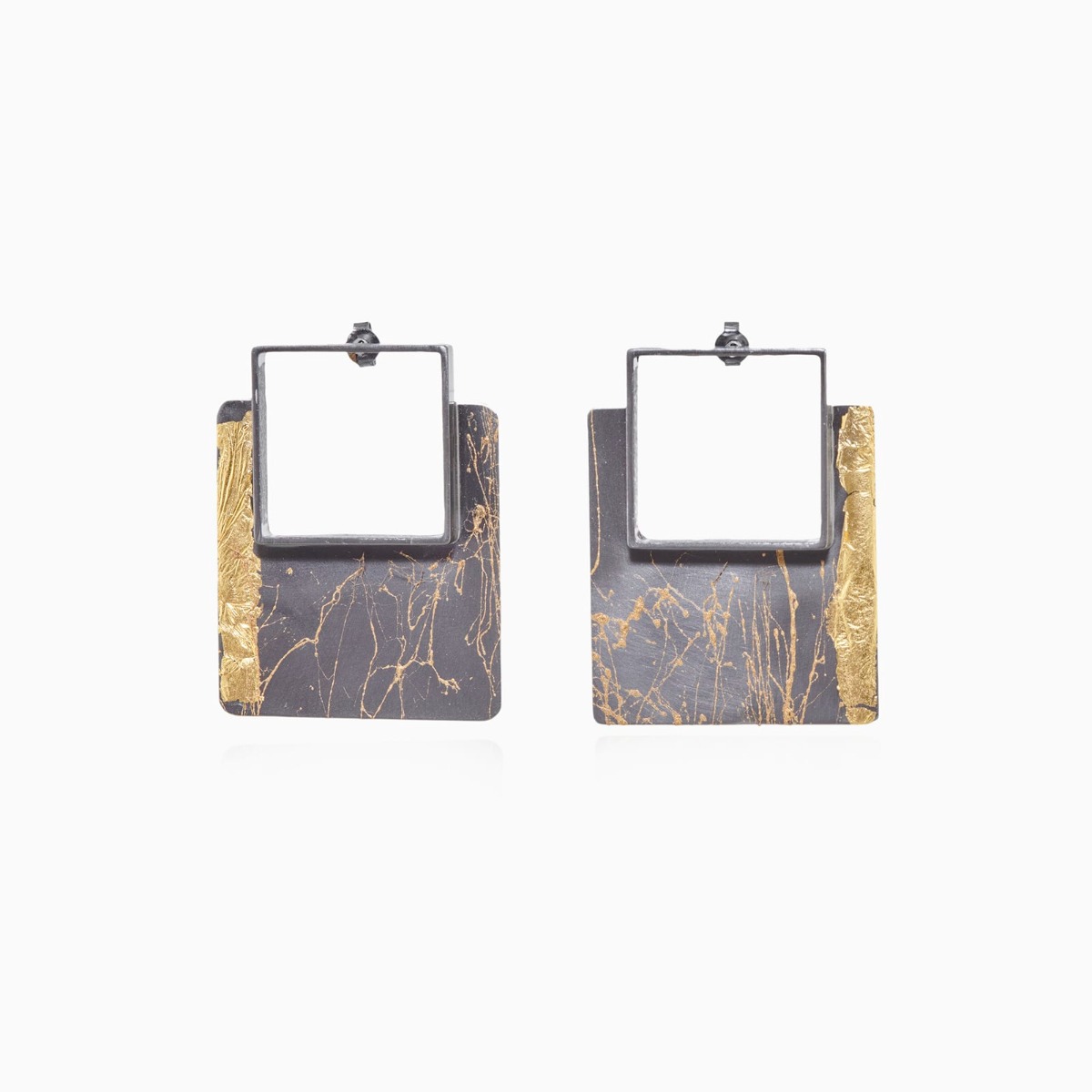 Ένα ενδιαφέρον industrial statement στην εμφάνιση προσφέρoυν αυτά τα σκουλαρίκια με την καθαρή γεωμετρία. Τα δυναμικά τετράγωνα πρωταγωνιστούν, ενώ το αποτέλεσμα απαλύνει η διακριτική λάμψη του χρυσού. •Ορείχαλκος με μεταλλική μαύρη επιμετάλλωση •Φύλλα χρυσού 24k