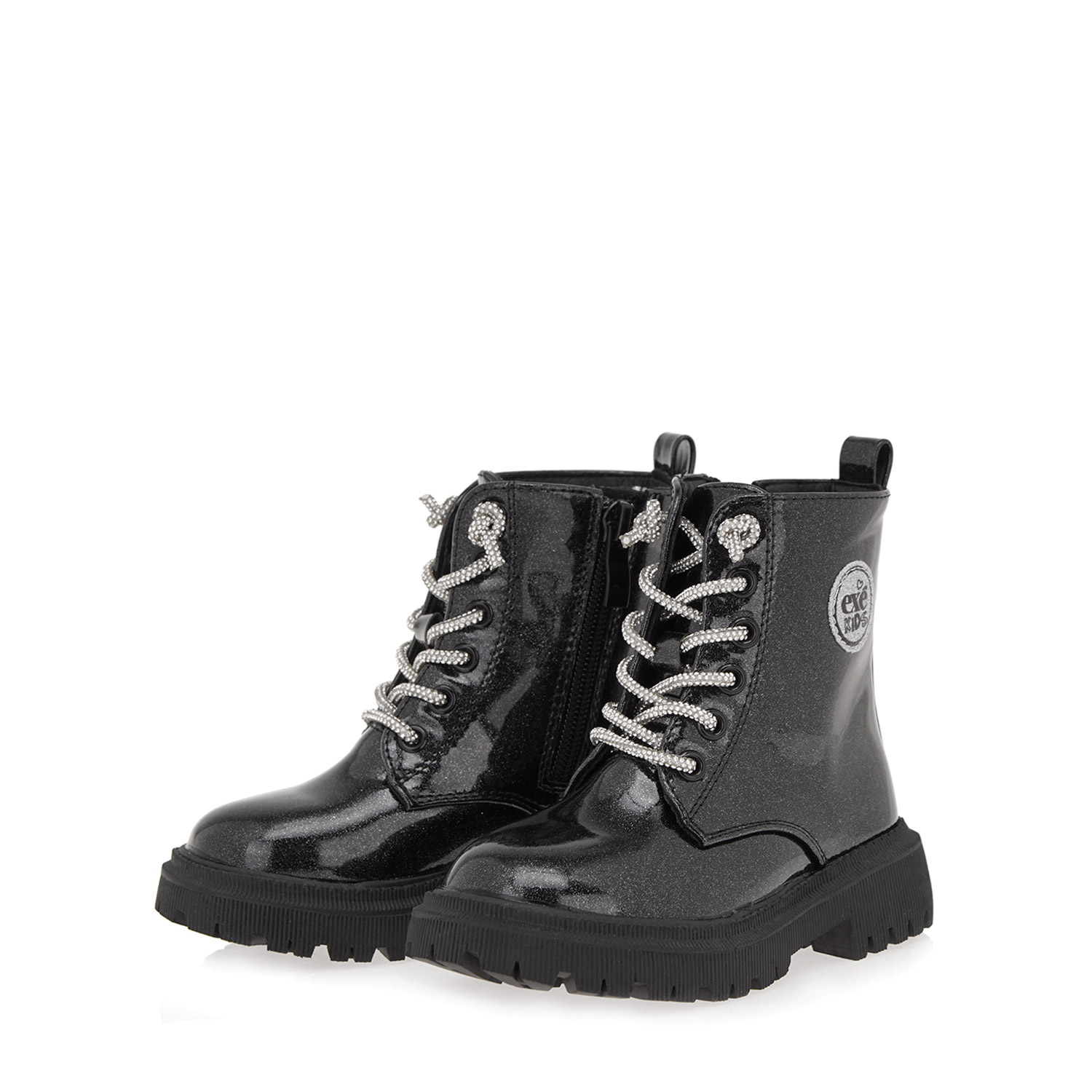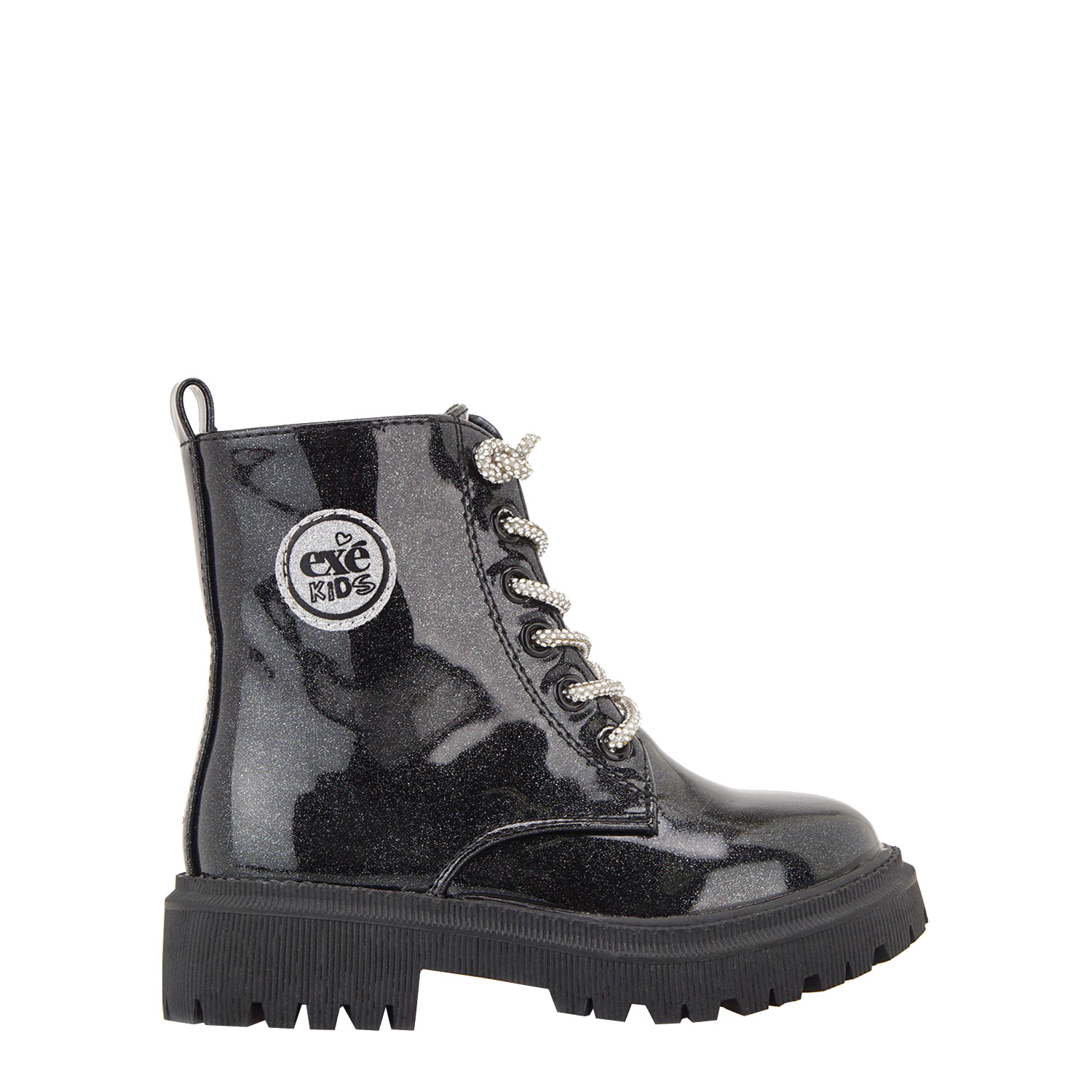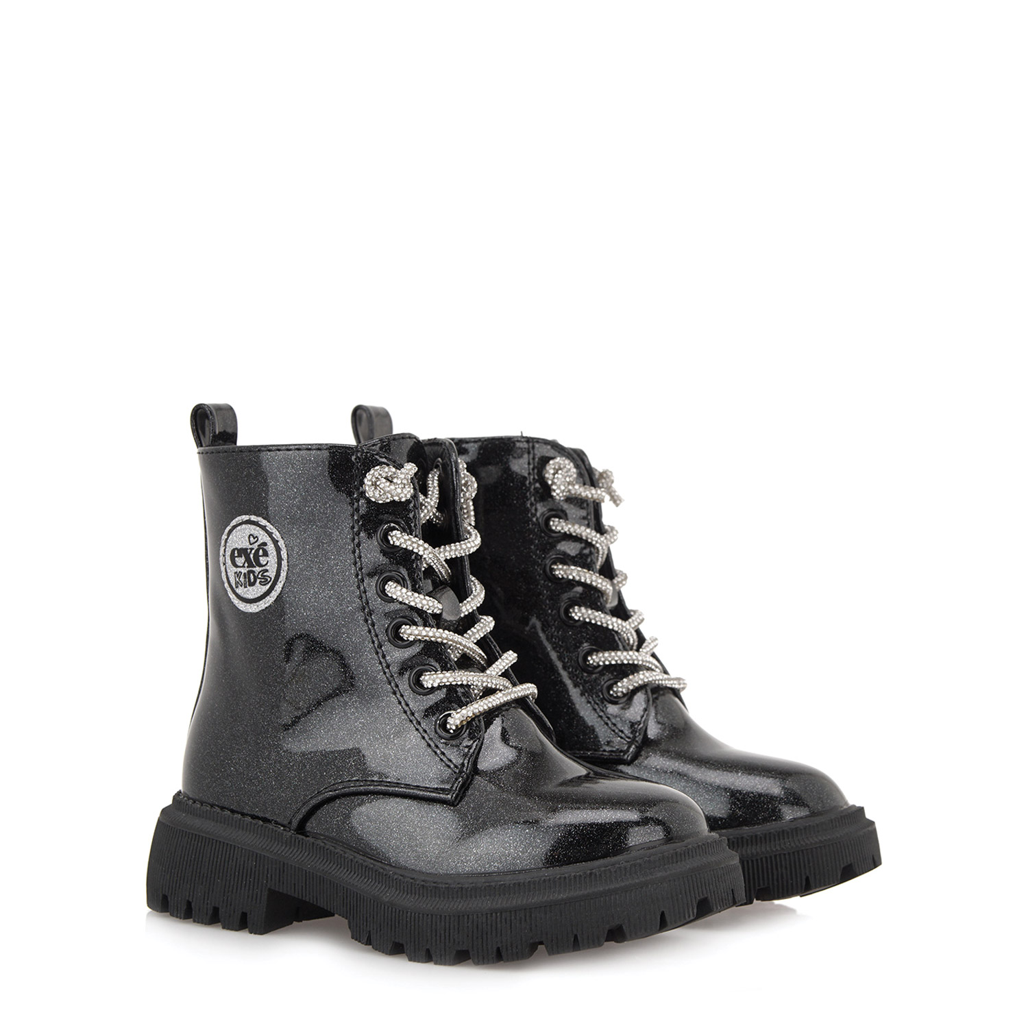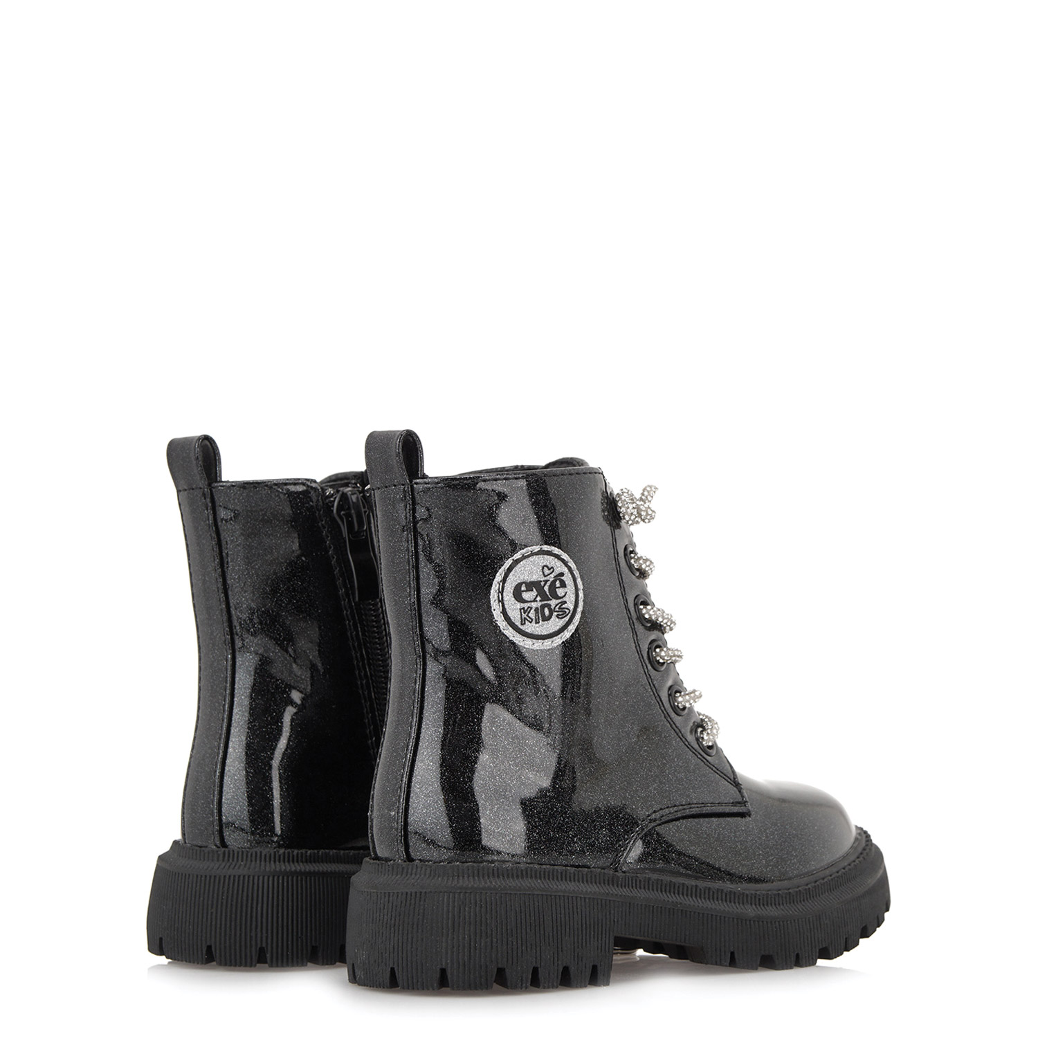 Exe παιδικό μποτάκι, σε μαύρο χρώμα με glitter, κατασκευασμένο από οικολογικό δέρμα. Ύψος σόλας 3.5εκ.