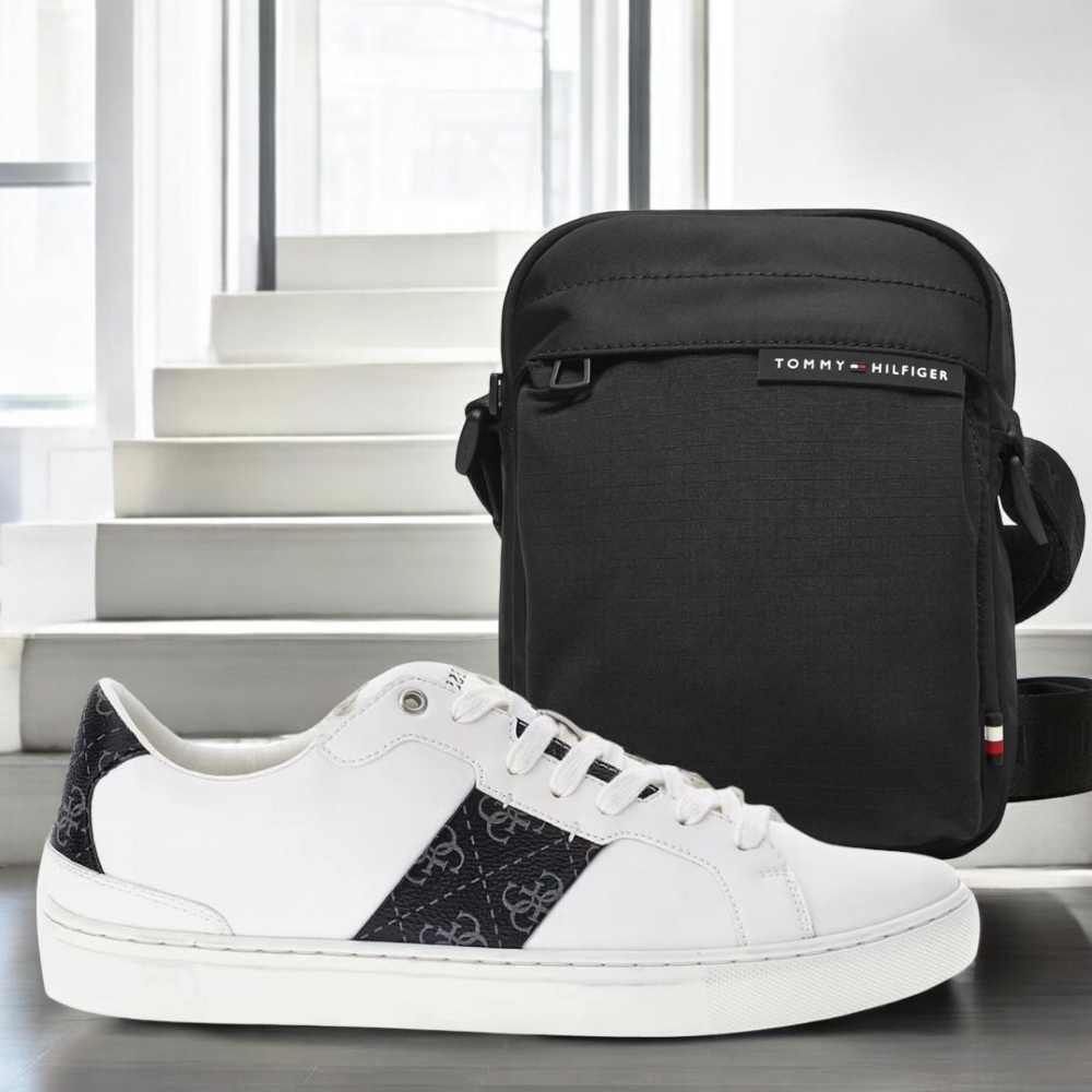 Σετ ανδρικό με έκπτωση. Αποτελείται από Guess ανδρικό sneaker και Tommy Hilfiger ανδρική τσάντα χιαστή.