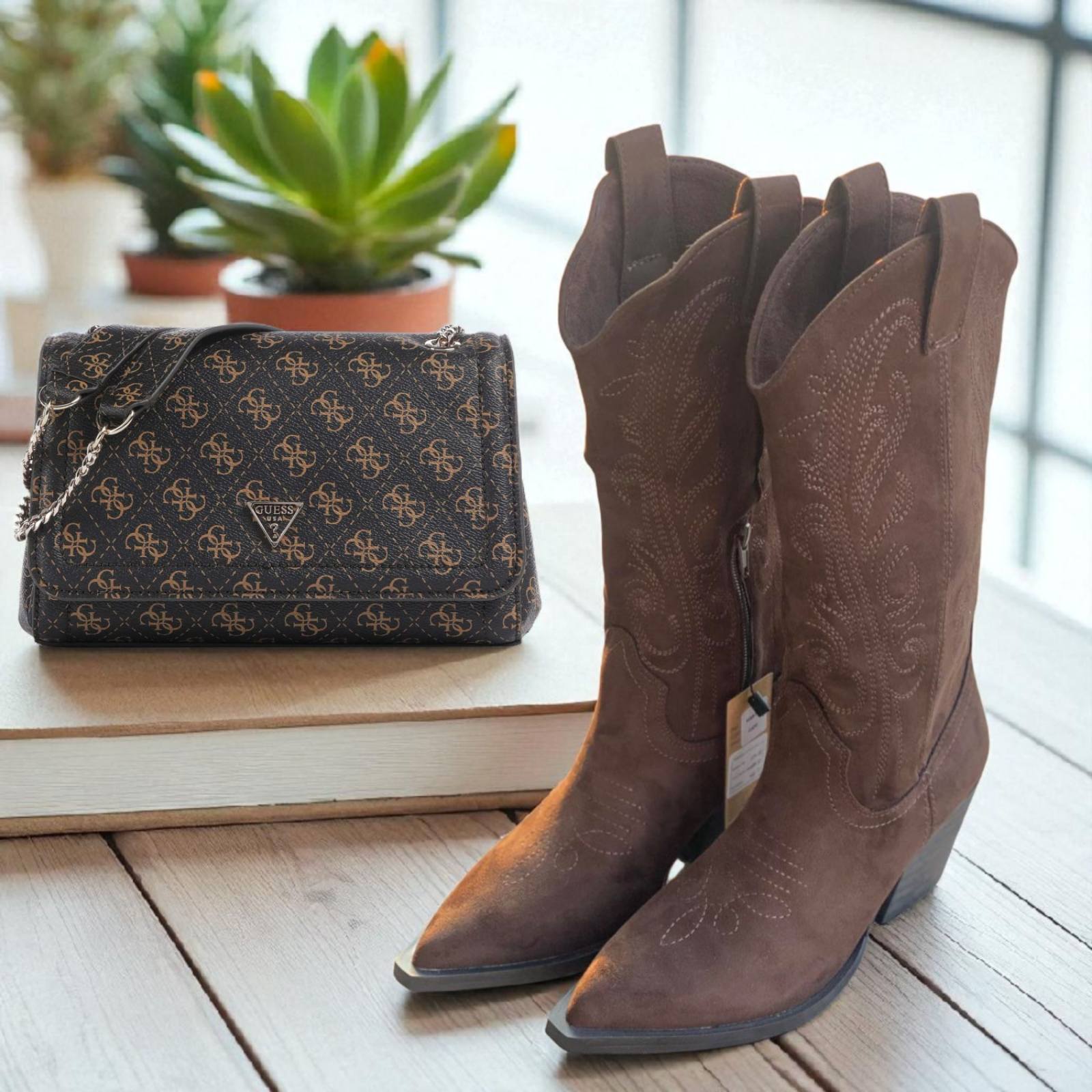 Σετ γυναικείο με έκπτωση. Αποτελείται από Guess γυναικεία τσάντα ώμου και Koniarisshoes γυναικεία μπότα.