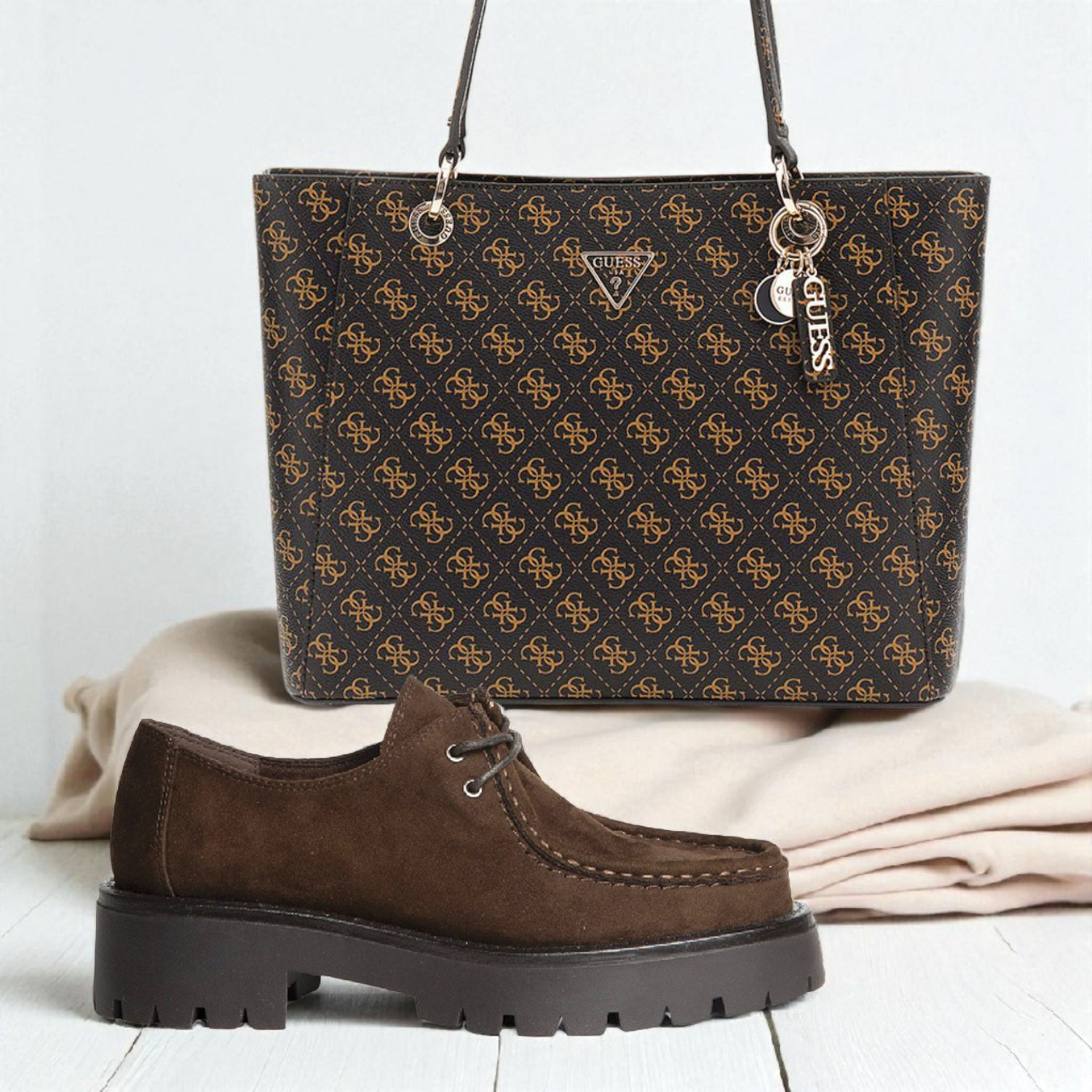 Σετ γυναικείο με έκπτωση. Αποτελείται από Guess γυναικεία τσάντα ώμου και Koniarisshoes γυναικείο loafer.