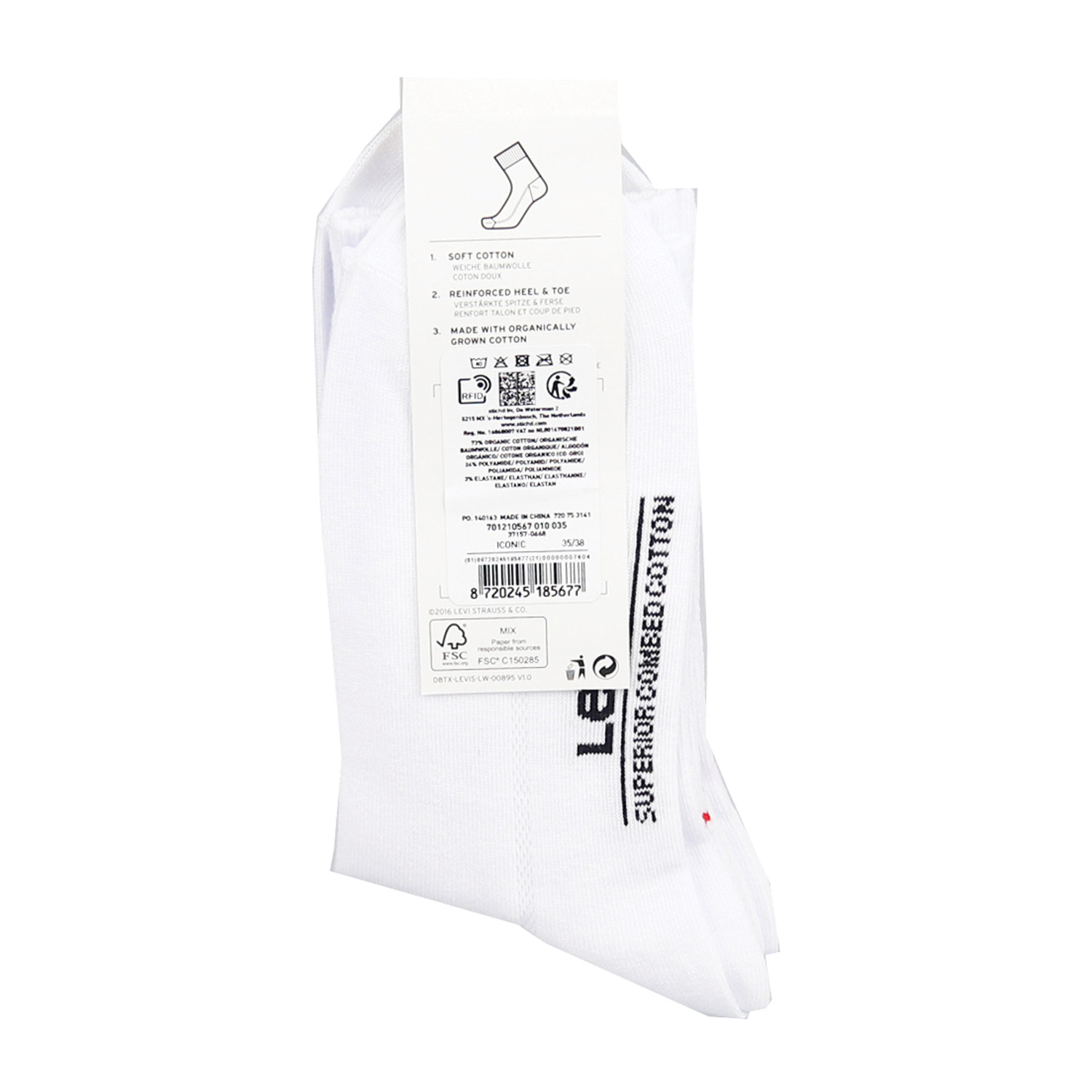 Levi's κάλτσες 2pack, σε λευκό χρώμα, κατασκευασμένες από 73% βιολογικά καλλιεργημένο βαμβάκι, 24% πολυαμίδιο, 3% ελαστάνη.